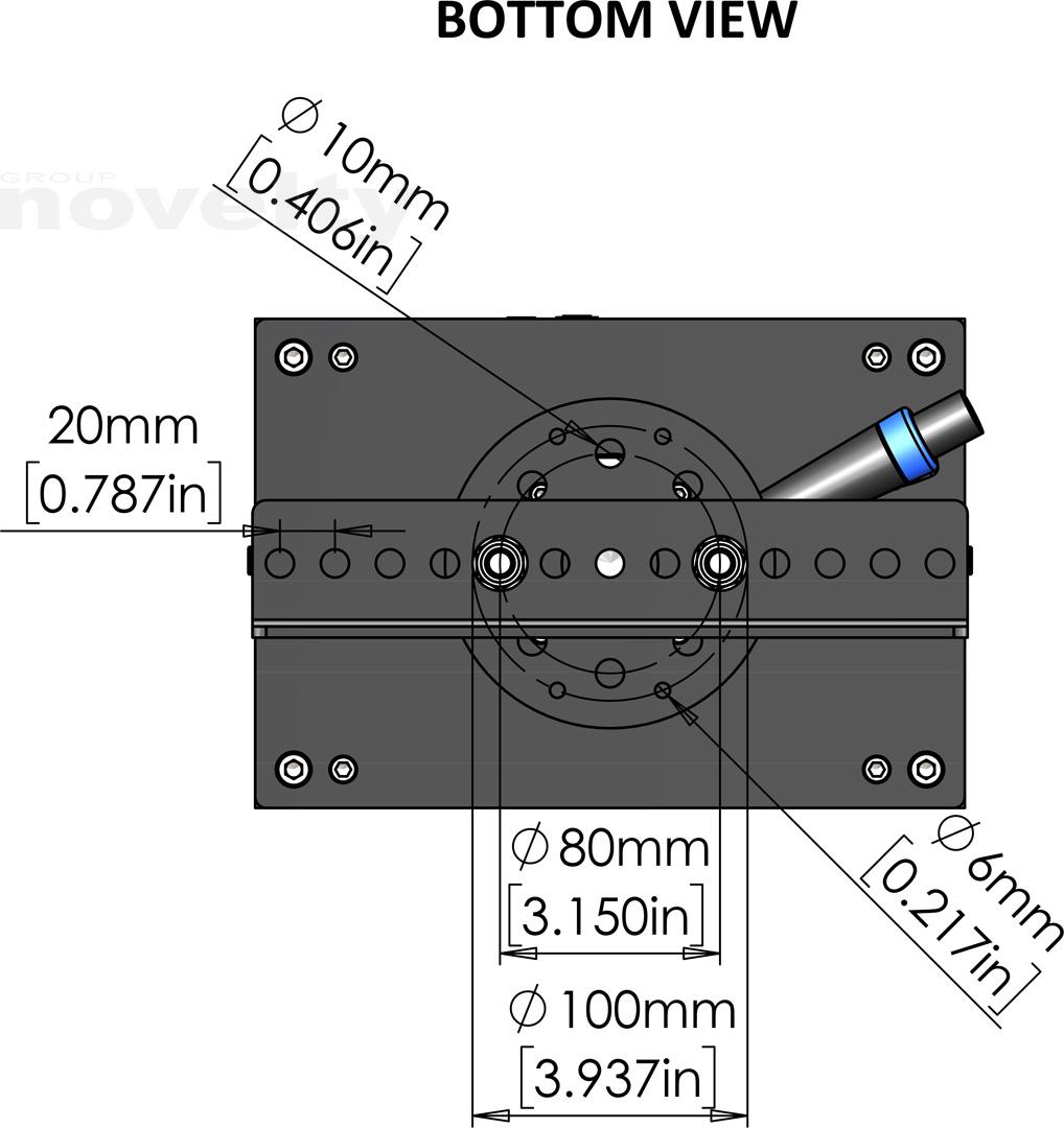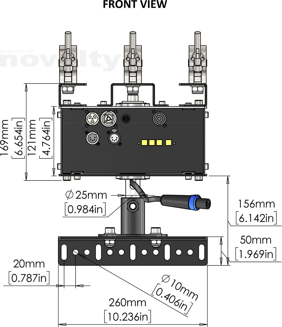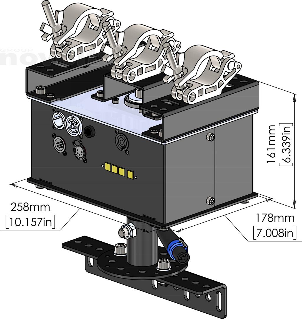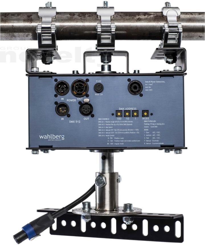 The DMX Rotator with power outlet contains 4 conductors emerging from the shaft. This way it is possible to power electrical equipment during rotation as well as controlling the equipment being rotated.