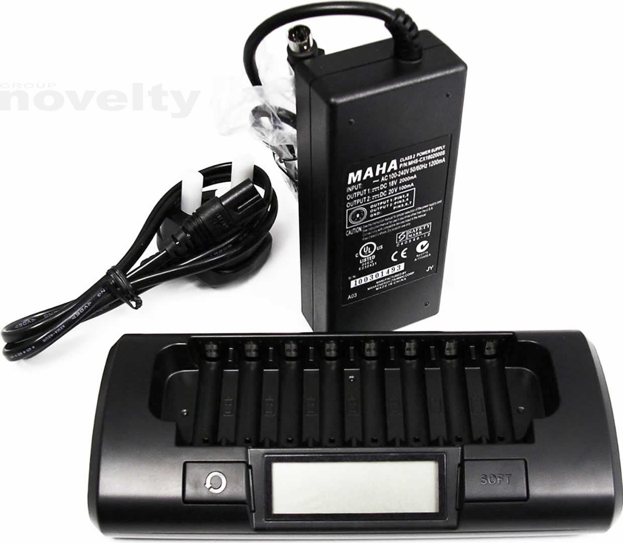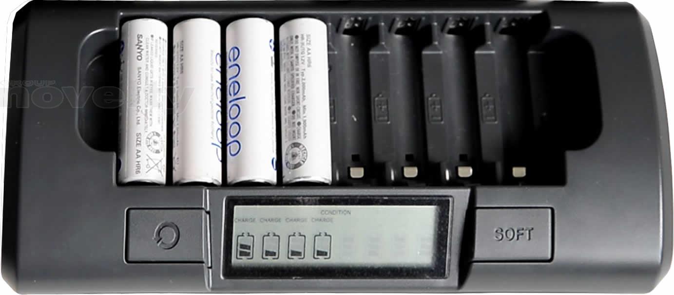 The charger has 8 independent charging circuits capable of charging 1-8 batteries in any combination. A large LCD screen shows the charging status of each battery. You have a choice of rapid and soft charge modes. Rapid charge enables 8 batteries to be fully charged to their maximum capacities in 1 hr. Soft charge takes about 2 hr but provides greater battery life, as well as compatibility with older, lower-capacity batteries.