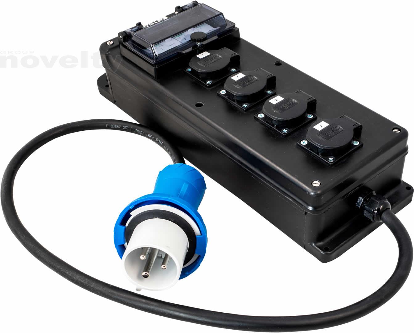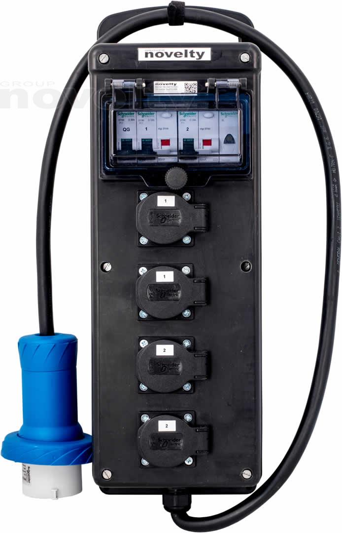 Sabot de distribution. Entrée : P17 32A mono. Sorties : 4 x PC16A. Protection différentielle 30mA