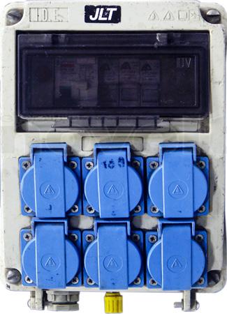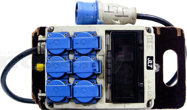 Boitier de distribution. Entrée : P17 32A mono. Sorties : 6 x PC16A. Protection différentielle 30mA