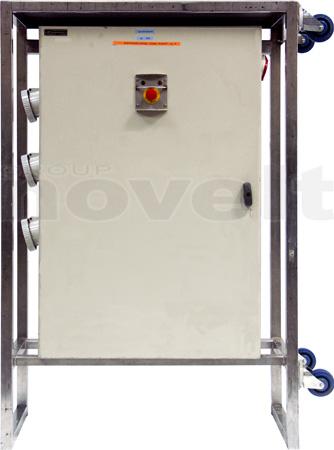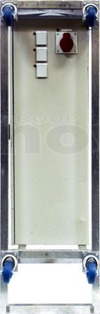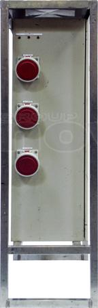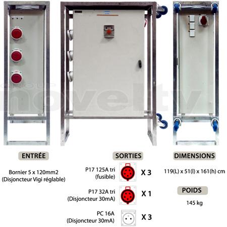 Armoire de distribution sur pied. Entrée : CAMLOCK. Sorties : 3 x P17 125tri + 1 x P17 32tri + 3 x PC16A. Protection différentielle 30mA
