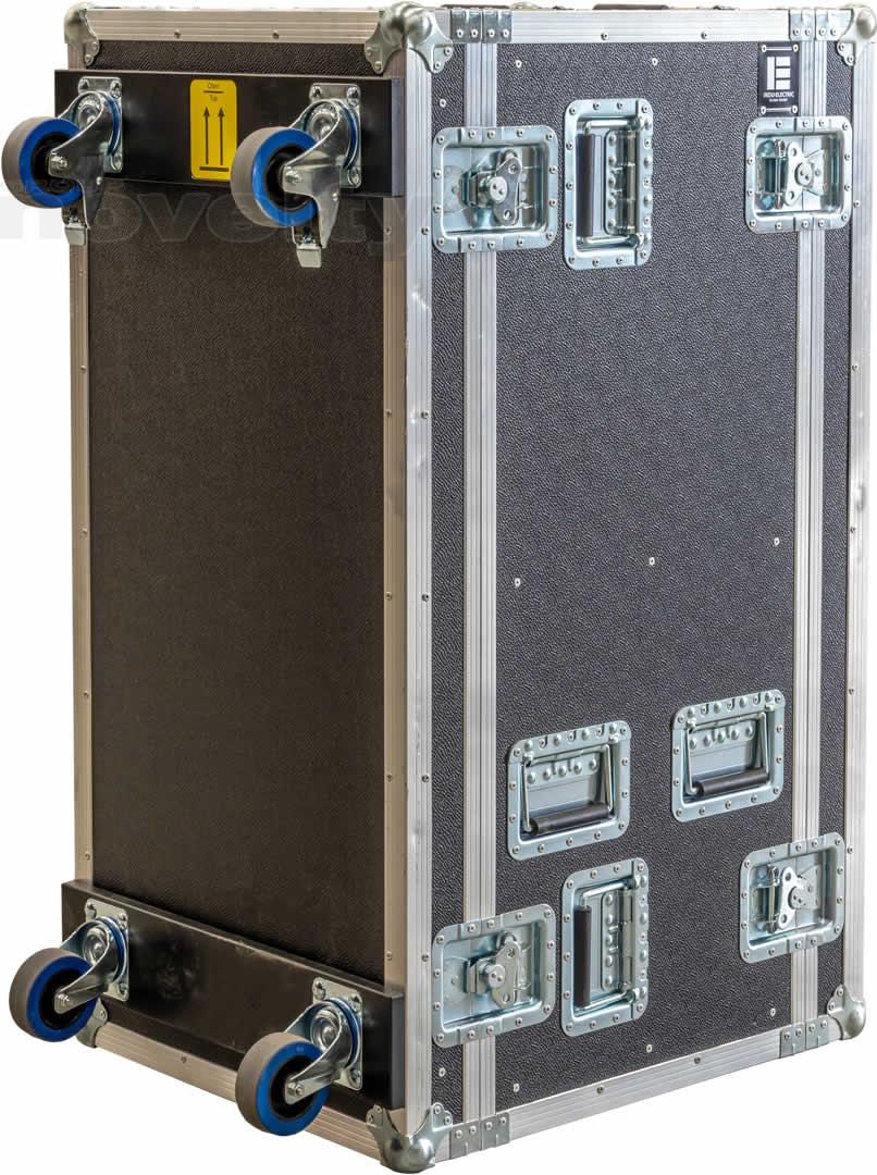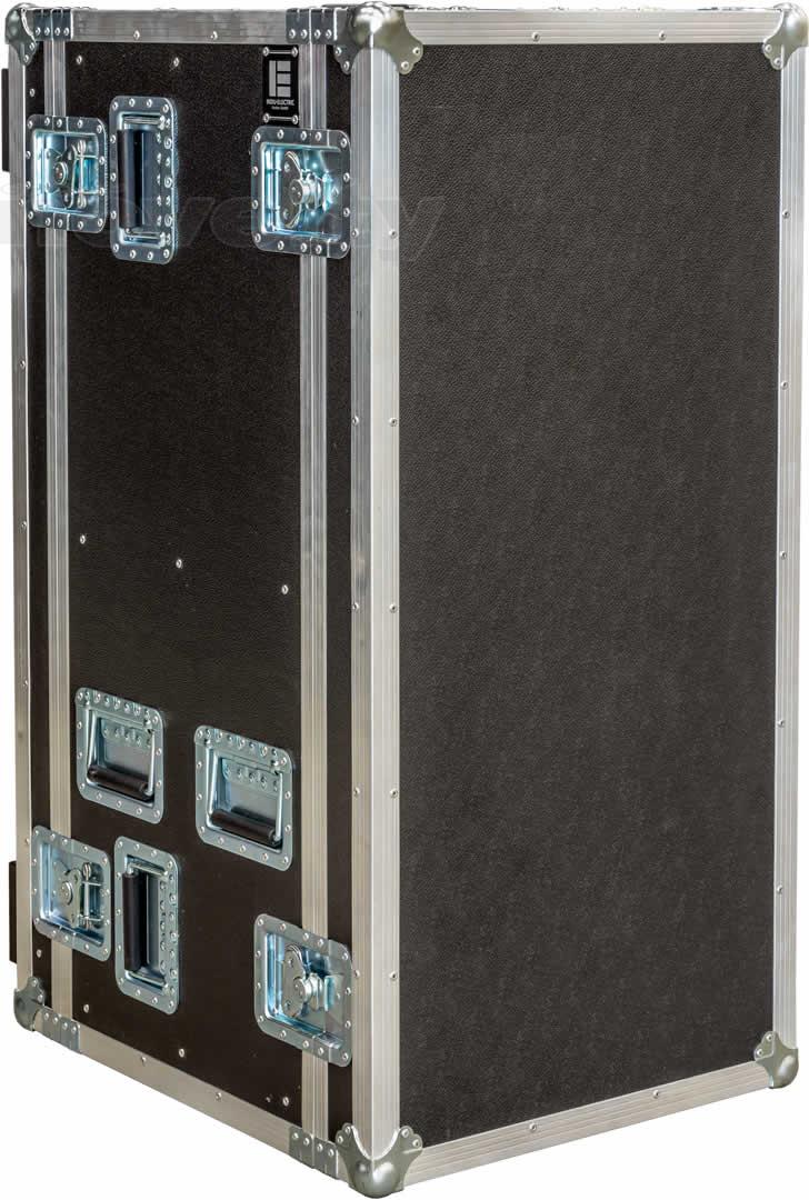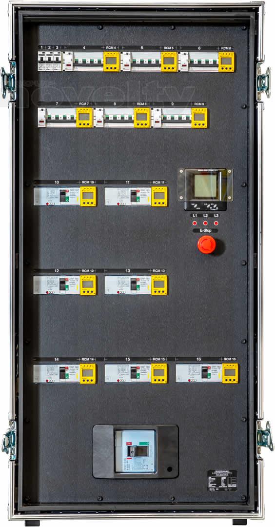Armoire de distribution en rack. Entrée : 2 jeux de Powerlock. Sorties : 5 x P17 125tri + 2 x P17 63tri + 6 x P17 32tri + 3 x PC16A. Protection différentielle réglable sur chaque départ. Dé-classable en 400A, 250A. Voltmètre et ampèremètre intégré.