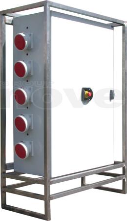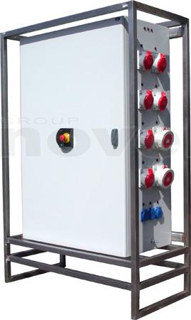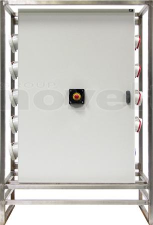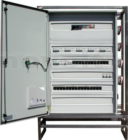 Armoire de distribution sur pied. Entrée : Bornier. Sorties : 5 x P17 125tri + 2 x P17 63tri + 6 x P17 32tri + 3 x PC16A. Protection différentielle 30mA. Dé-classable en 400A