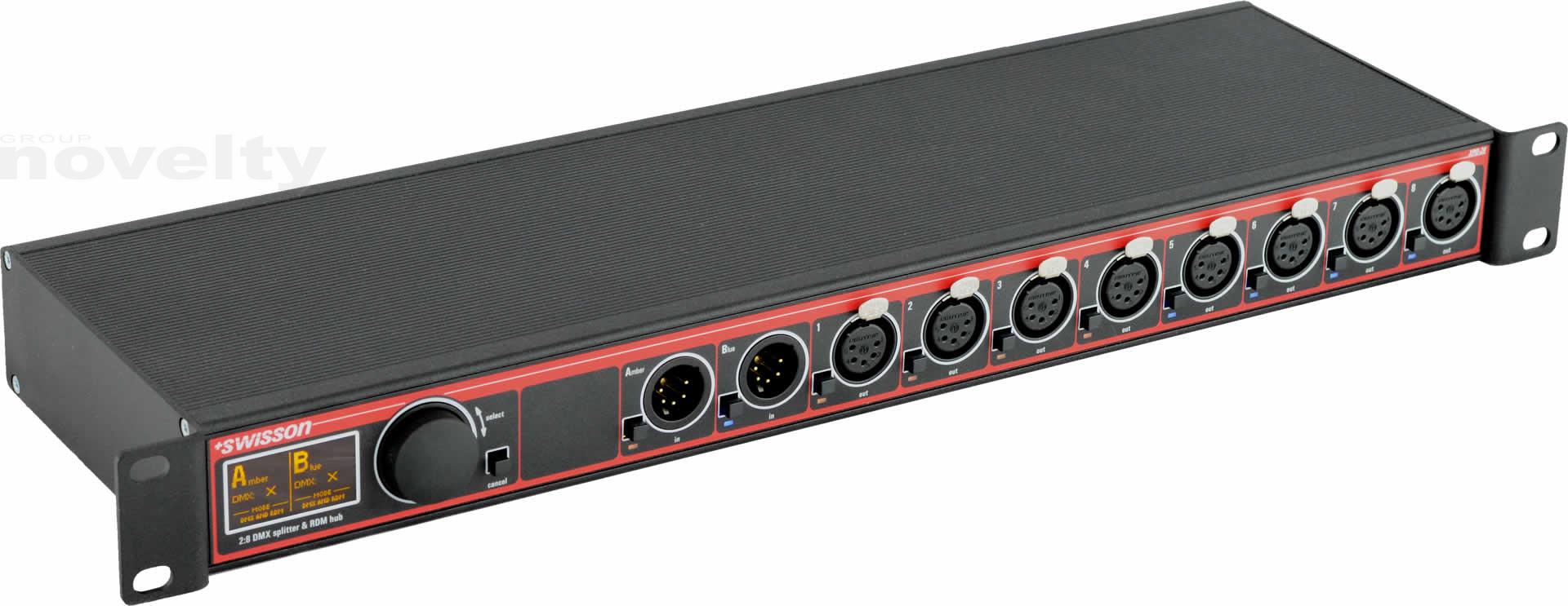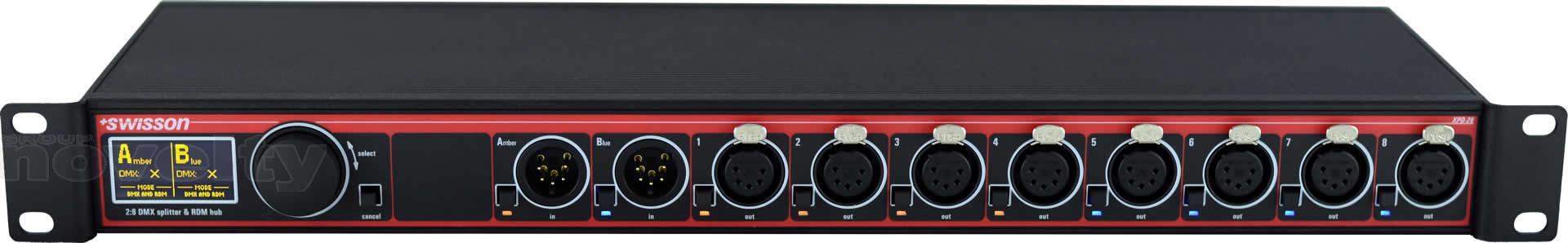 XPD-28 splitters boost, refresh and distribute the DMX signals of two inputs onto eight outputs. This allows for safely going beyond the 32 devices limit of the DMX standard, as well as for building star topologies. Moreover, the XPD-28 can be used as a repeater in order to transport a DMX signal across larger distances just as well.