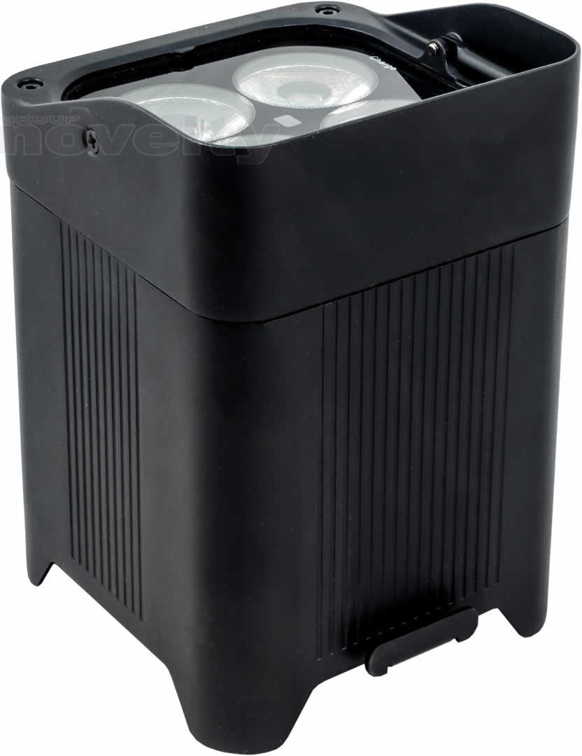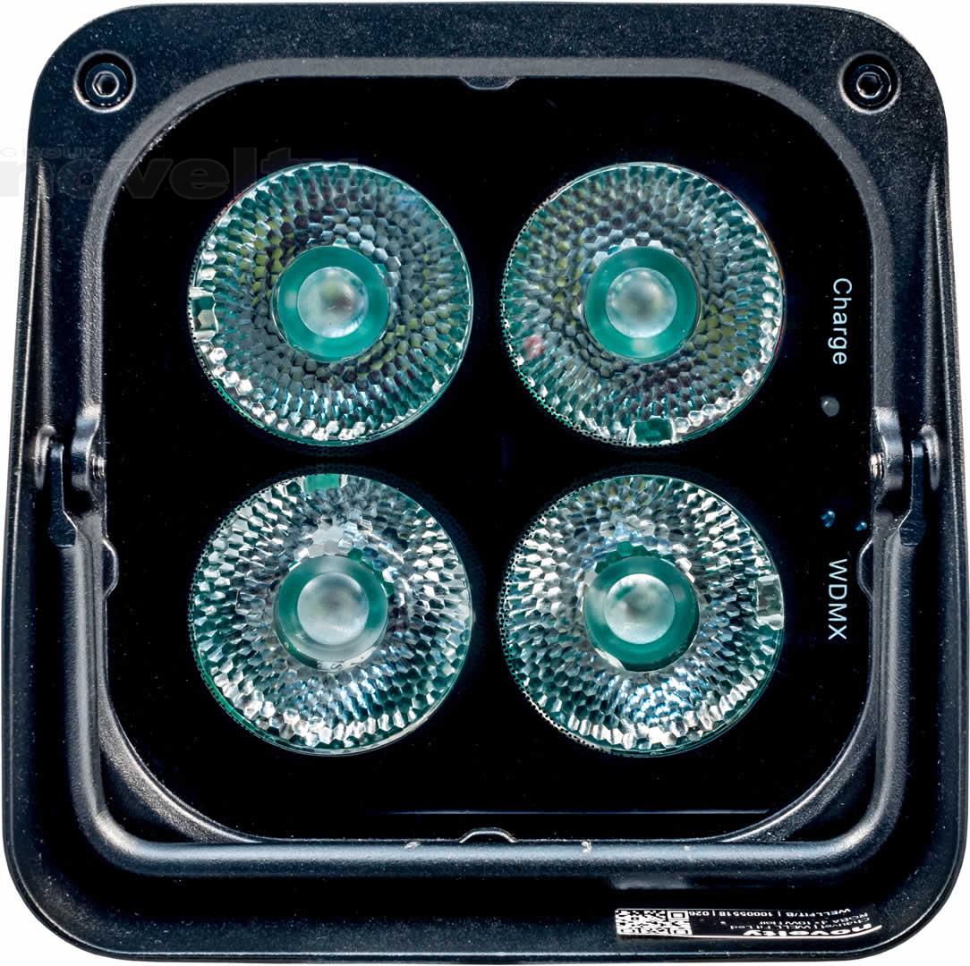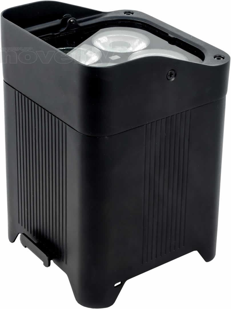 - A completely wireless IP65 rated battery powered up-light with four high powered quad colored RGBW LEDs that is controlled by W-DMX or IR remote.
