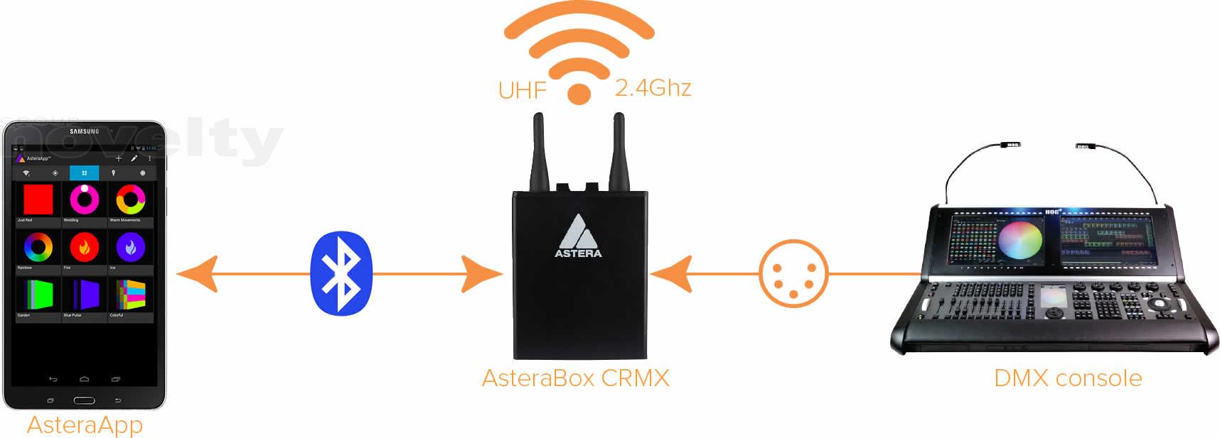 AsteraBox receives Bluetooth command from any Android tablet or phone, and sends the RF signal to a wireless Astera lamp