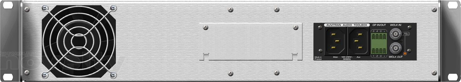 - Face arrière : 1xIEC admission de puissance principale AC Alimentation électrique / 7 slots avec la carte mère transportent pour les cartes interfaces / 2x BNC for word clock/ 1×6 pole Euroblock connecteur pour GPIO