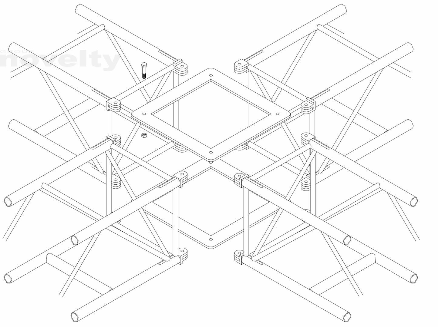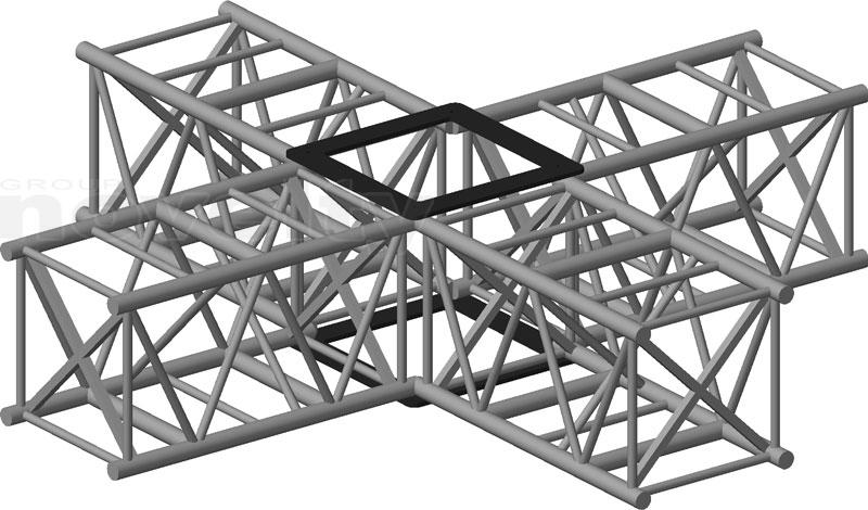 Poutre carrée 52 x 52 cm avec tubes principaux de 50,8 mm de diamètre (épaisseur 4 mm) et diagonales de 25,4 mm de diamètre (épaisseur 3,2 mm) en aluminium 6082-T6. La conception des poutres permet le montage entre elles par assemblage de fourches horizontales unisexes qui évitent l’utilisation de pièces d’angle complexes et onéreuses