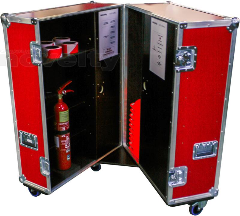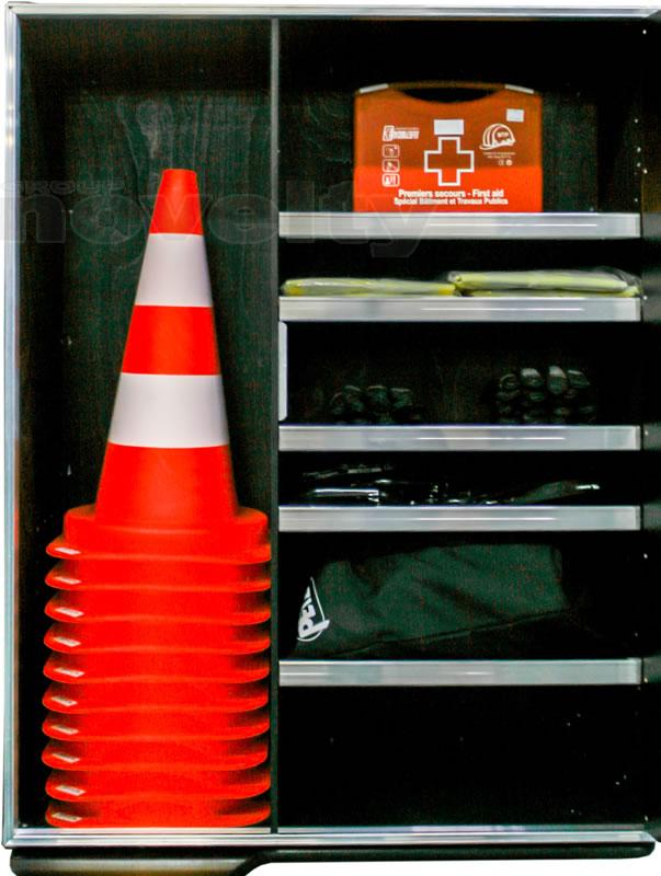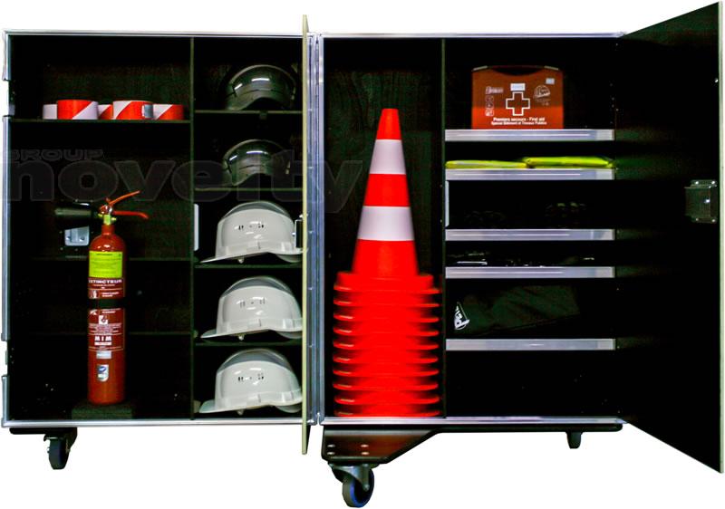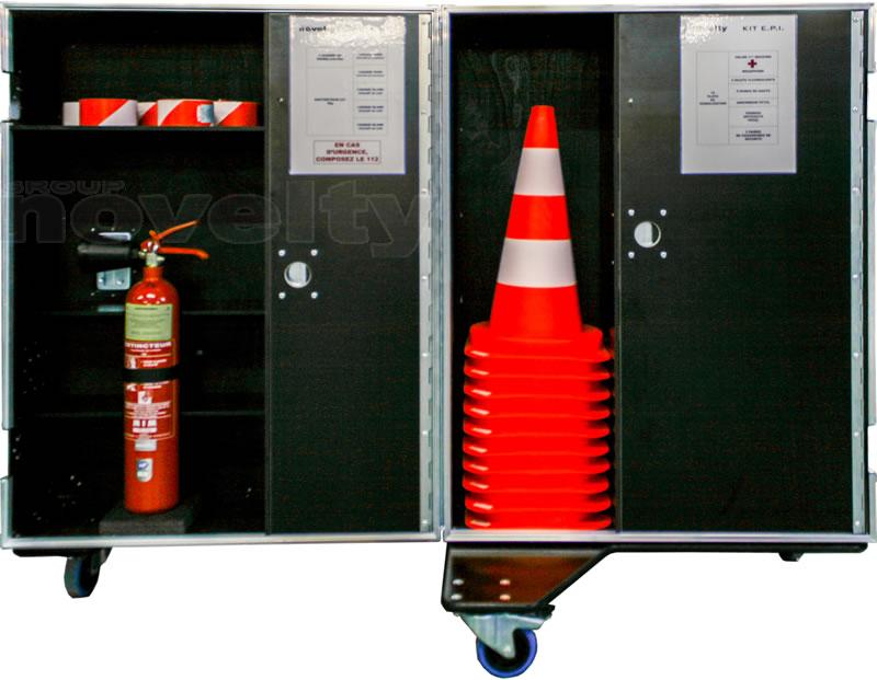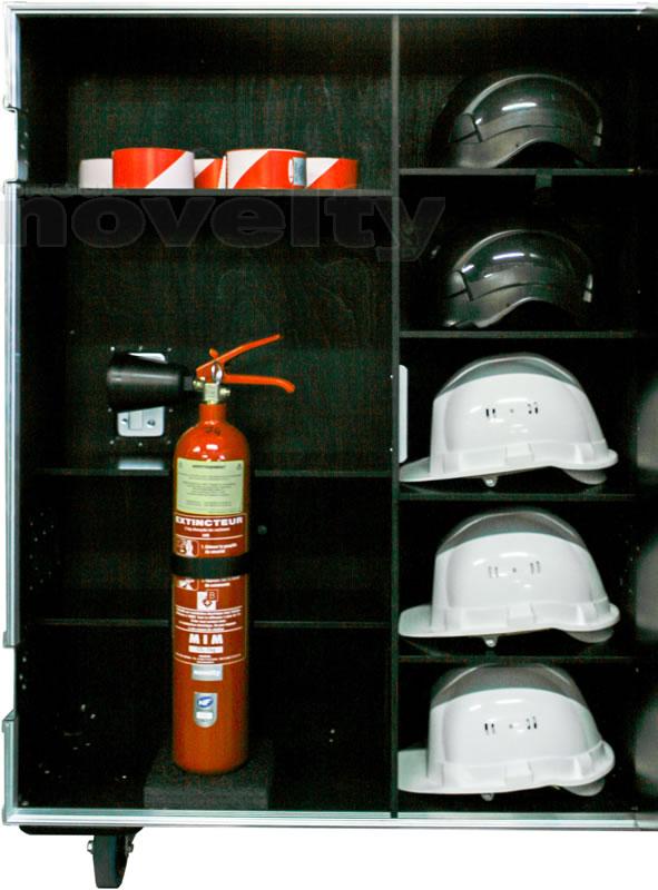 Kit EPI comprenant : 1 extincteur CO2, 5 rubans de rubalise, 5 casques de chantier, 10 plôts de signalisation, 1 trousse de premier secours, 5 gilets fluorescents, 5 paires de gants, 1 absorbeur PETZL, 1 harnais antichute PETZL, 1 paire de chaussures de sécurité.