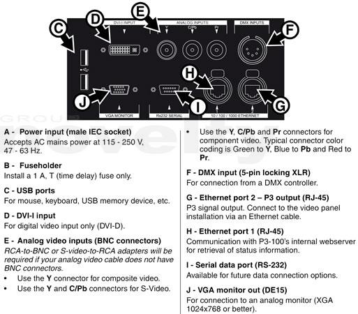 Le Système Contrôleur P3-100 est un robuste processeur vidéo et unité de distribution qui permet de marier la lumière avec la vidéo et les technologies scéniques pour une intégration visuelle vraie. Fonctionnant sous Linux et d'un espace de stockage conséquant, un seul P3-100 peut contrôler jusqu'à 500 000 pixels. Il fait office de "scaller" et de "de-interlacing".