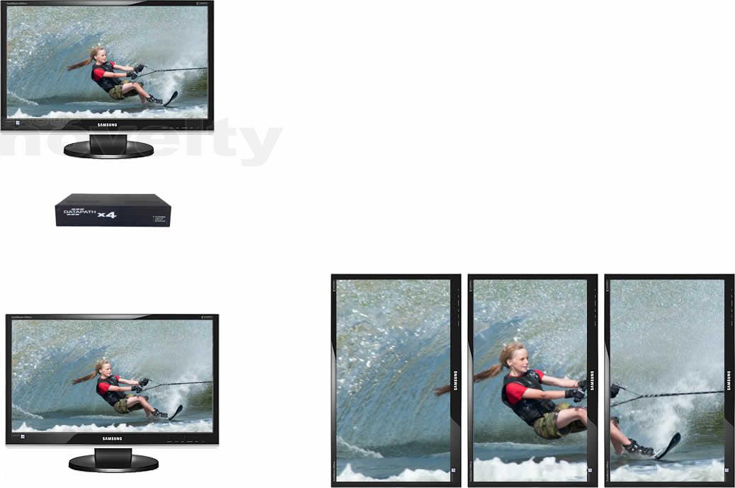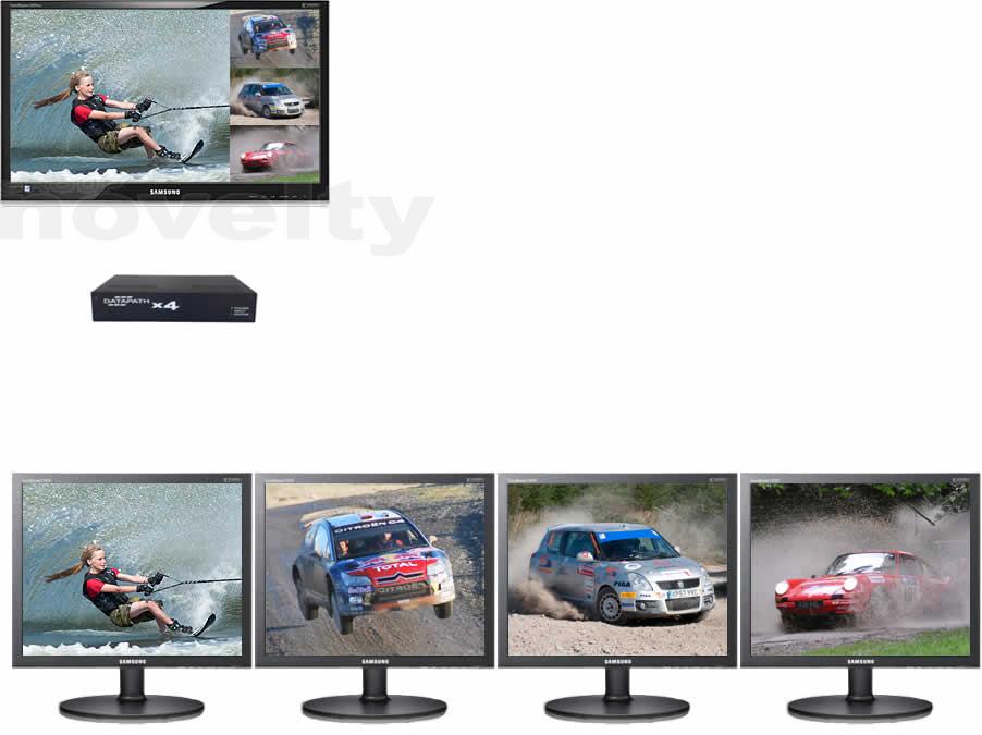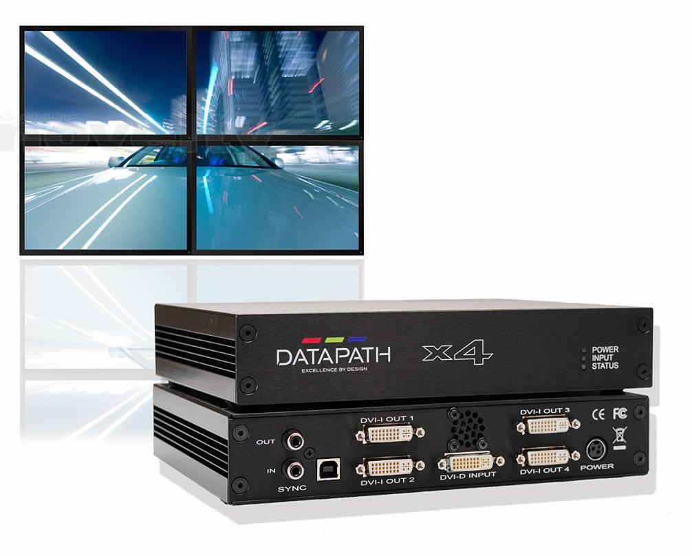 The Datapath x4 is a stand alone display wall controller that accepts a standard single or dual-link DVI input and can flexibly display this across four output monitors. Each output can be driven as DVI or analog RGB, and can represent an arbitary crop region of the original input image. The output resolution and frame rate does not need to be related to that of the input, as the Datapath x4 will optionally upscale and frame rate convert each cropped region independently. Additionally mixes of landscape and portrait monitors are supported. Supports full bezel width and height correction for all types of displays Ideal for use with edge blending projectors - supports image overlapping Splits a dual-link DVI, single-link DVI or HDMI* input (* HDMI input requires the optional DVI/ HDMI adapter) The input EDID is programmable to allow arbitary input resolutions and frame rates Flexibly drives multi-displays, each from any selected region of the input image Supports both DVI and analog RGB output monitors Stand alone operation supports auto-detecting of input resolution and output monitor native resolutions. Output screen configuration is defined by internal non-volatile memory Output configuration is programmable via a USB connection to a PC. Graphical utility allows easy control of cropping, scaling, rotation and gapsInformations