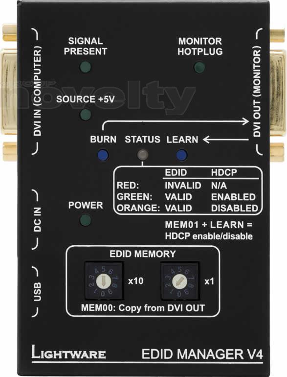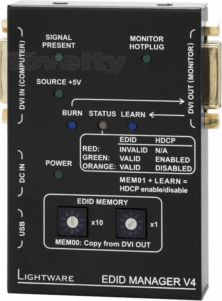 Lightware's EDID Manager V4 is an HDMI/DVI EDID emulator and repeater that can store 79 EDIDs. It emulates and keeps a fixed EDID for the source. Thanks to our Advanced EDID Management, the device can trick the DVI source (PC computer, laptop, etc.) by emulating any DVI display (LCD monitor, projector) for continuous video output - even if the AV system is disconnected or powered down. In emulating an EDID, the user can set up any DVI or HDMI output resolution, regardless of the used projector or monitor. This ensures that the overall system resolution can be controlled. EDID memories 01 to 49 are factory preset and memories 51 to 79 are user programmable. Memory 00 is transparent which means that the attached display device's EDID (monitor or projector) will be reported back to the source. In this mode the unit works as a simple repeater. The EDID Manager automatically compensates for up to 60 meters of DVI copper cable at 22AWG.